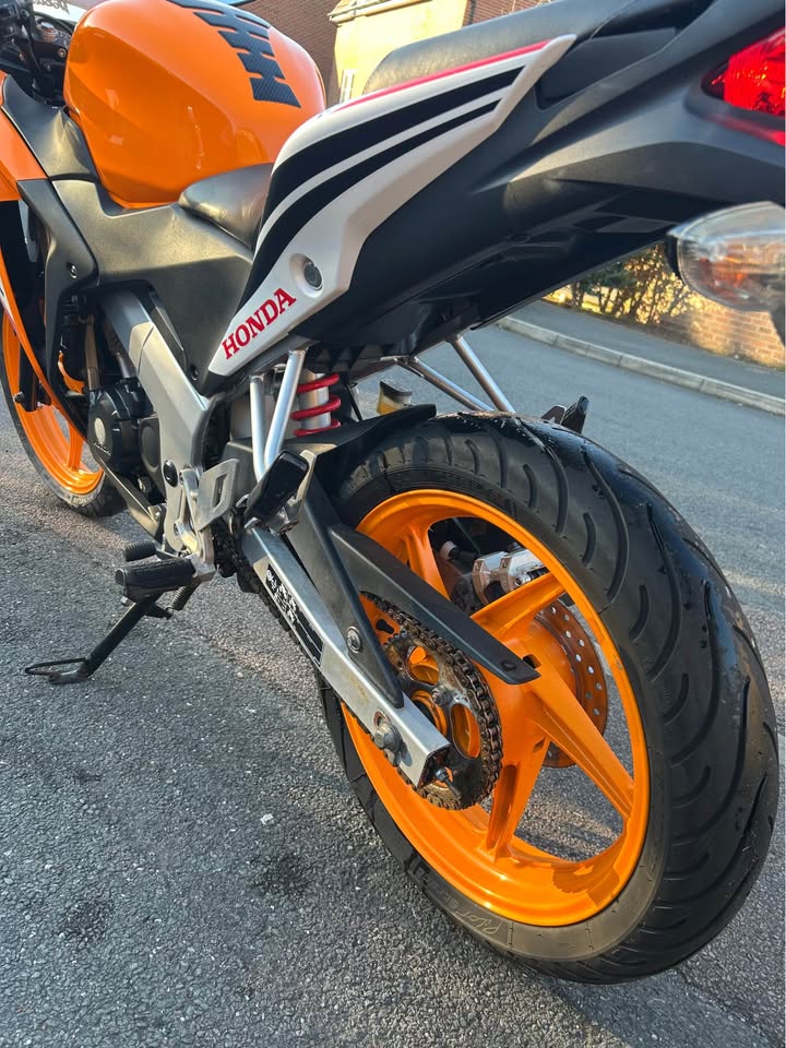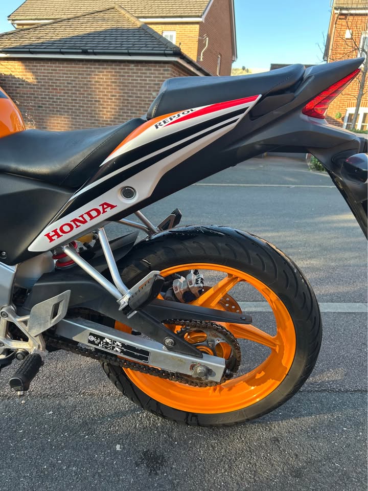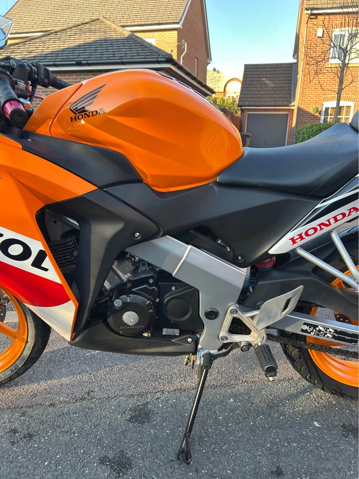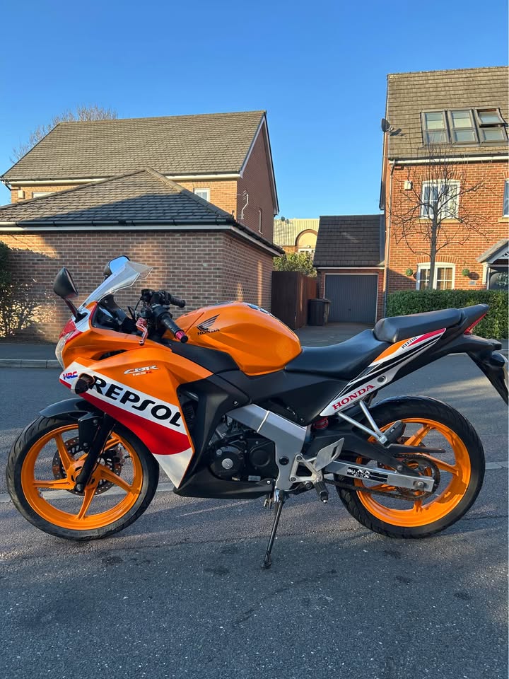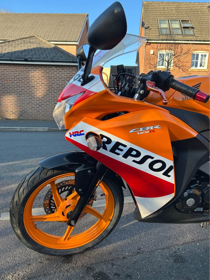 Here is a Honda CBR 125R 2016 in orange repsol covering only 13.9k miles! Really nice bike for mileage and age! Comes with; Full log book Full HPI clear MOT Recently had new Michelin tyres Brand new genuine exhaust guard Have a new pair of black bar ends to go with the sale! The bike starts, runs, rides and stops perfectly! Engine is nice and quiet with the standard exhaust. Few marks here n there but nothing major